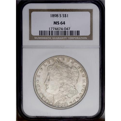 <B>1898-S<img border='0' src='http://www.heritagecoins.com/images/star.gif' width=10 height=10>$1> MS64 NGC.</B></I> Lustrous silver-gray surfaces see splotches of olive-green and reddish-gold around the peripheries, especially on the reverse. Except for softness in the hair curl over the ear, the design elements are nicely brought up. A few minute contact marks and luster grazes on Liberty's cheek limit the grade. <BR><BR><B>Important notice:</B> Heritage usually auctions material at the rate of 200-250 lots per hour. On some occasions eBay Live bid software or the Internet may not be able to keep up with the pace of the auction. We recommend placing a realistic absentee bid now as insurance to avoid disappointment. Occasionally the auctioneer may eliminate or reject an eBay Live bid, and the auctioneer may also reopen a lot after the close of the eBay live bidding (usually because we missed an audience bid), and may reject your bid even if it shows you as the winning bidder. By bidding via eBay Live, you agree that Heritage may award the lot to another bidder at its sole discretion under the circumstances described above or any other reasonable circumstances. Since eBay bids are not shown to us until we open the lot on the floor, we treat those bids just like floor bids. In most cases the floor responds before the eBay bid is presented to us, due to Internet lag time, so for consistency we have made it a policy that floor bids are always considered first over tie eBay live bids. Also please note that all Heritage lots purchased through eBay Live carry a 20% Buyer's Premium. Please make sure you read the Terms and Conditions before you bid. This lot is being auctioned in conjunction with a live floor auction by Heritage Galleries & Auctioneers. All final auction and invoice information will be supplied by Heritage Galleries & Auctioneers, and all other information should be considered preliminary. Lot:3729 <BR><BR><B>Winning Notification and Billing:</B> After the FINAL session in this auction is complete, Heritage will send e-mail and snail mail invoices. This process normally takes several days. All final auction and invoice information will be supplied by Heritage Galleries & Auctioneers, and all other information should be considered preliminary. <BR><BR>This auction will be conducted on a live auction floor and over the Internet through eBay Live. If you choose to place an absentee bid, please take a moment to <font color='#0000ff'><u><a href='http://pages.ebay.com/liveauctions/help/before/laabsentee.html'>learn how eBay Live absentee bidding works</a></u></font><font color='#000000'>