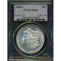 1898-S S$1 MS64 PCGS. The fields on this '98-S hav <B>1898-S S$1 MS64 PCGS.</B></I> The fields on this '98-S have a near prooflike appearance. Well struck, with white surfaces that are lightly abraded. <BR><BR><B>Important notice:</B> Heritage usually auctions material at the rate of 200-250 lots per hour. On some occasions eBay Live bid software or the Internet may not be able to keep up with the pace of the auction. We recommend placing a realistic absentee bid now as insurance to avoid disappointment. Occasionally the auctioneer may eliminate or reject an eBay Live bid, and the auctioneer may also reopen a lot after the close of the eBay live bidding (usually because we missed an audience bid), and may reject your bid even if it shows you as the winning bidder. By bidding via eBay Live, you agree that Heritage may award the lot to another bidder at its sole discretion under the circumstances described above or any other reasonable circumstances. Since eBay bids are not shown to us until we open the lot on the floor, we treat those bids just like floor bids. In most cases the floor responds before the eBay bid is presented to us, due to Internet lag time, so for consistency we have made it a policy that floor bids are always considered first over tie eBay live bids. Also please note that all Heritage lots purchased through eBay Live carry a 20% Buyer's Premium. Please make sure you read the Terms and Conditions before you bid. This lot is being auctioned in conjunction with a live floor auction by Heritage Galleries & Auctioneers. All final auction and invoice information will be supplied by Heritage Galleries & Auctioneers, and all other information should be considered preliminary. Lot:7702