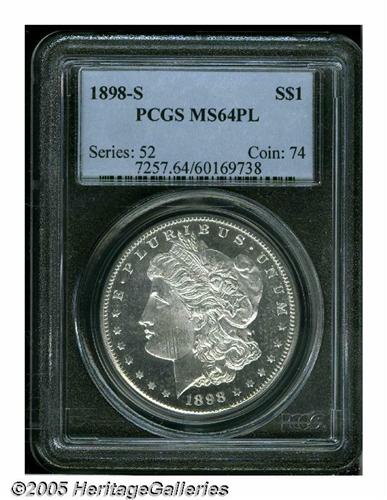 <B>1898-S<S$1> MS64 Prooflike PCGS.</B></I> Impressive prooflike example with bright mirrored fields and lightly frosted devices. Well preserved for the grade, with a few light parallel frosting scuffs noted on Liberty's lower cheek for accuracy. Population: 27 in 64 prooflike, 2 finer (6/05).