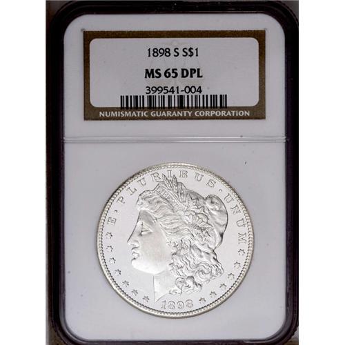 <B>1898-S S$1 MS65 Deep Prooflike NGC.</B></I> Most observers would consider this beautiful Gem to be fully brilliant, but a whisper of tan on Liberty's cheek is noted for accuracy. The devices are thickly frosted and provide excellent white-on-black contrast with the impressively reflective fields. This example is sharply struck and, save for a trace of softness on the eagle's left (facing) claw, the strike could be regarded as full. No marks are worthy of comment, and the reverse on its own approaches an even higher grade. This is the finest Deep Prooflike 1898-S dollar (and only Gem) NGC has certified (10/06).<BR><BR><b>Shipping:</b> Coin/Currency (<a target="_blank" href="http://www.heritageauctions.com/common/shipping.php">view shipping information</a>)