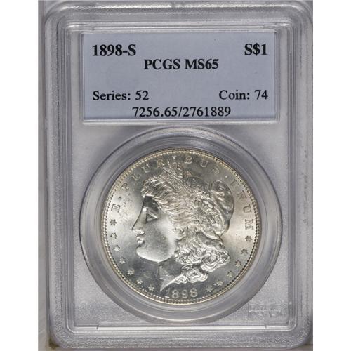 <B>1898-S<img border='0' src='http://www.heritagecoins.com/images/star.gif' width=10 height=10>$1> MS65 PCGS.</B></I> Light reddish-brown patina covers the upper half of the obverse. An elusive Gem with brilliant luster, a sharp strike, and few contact marks for the grade.<BR><I>From The Chicago-Ark Collection.</B></I>