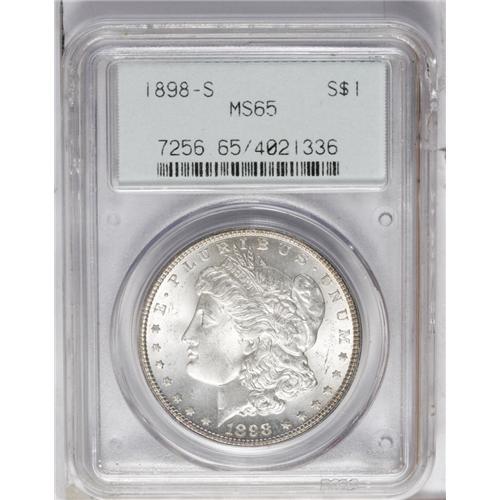 <B>1898-S<img border='0' src='http://www.heritagecoins.com/images/star.gif' width=10 height=10>$1> MS65 PCGS.</B></I> A solidly struck and essentially untoned Gem. The lustrous surfaces have only small marks that do not interfere with this piece's eye appeal.