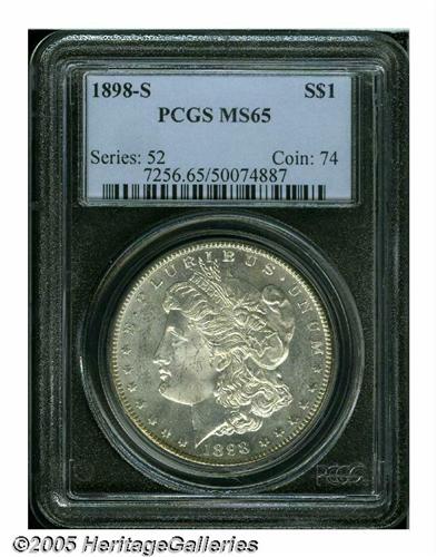 <B>1898-S<S$1> MS65 PCGS.</B></I> Well struck, save for minor weakness above the ear, and highly lustrous, with rolling cartwheel splendor in the fields, and light touches of milky pale gold patina on the otherwise untoned surfaces. There are faint roller marks (as struck) on Liberty's jaw, and a few wispy grazes on the cheek, and in the left obverse field. A scarce issue above the MS65 grade level.