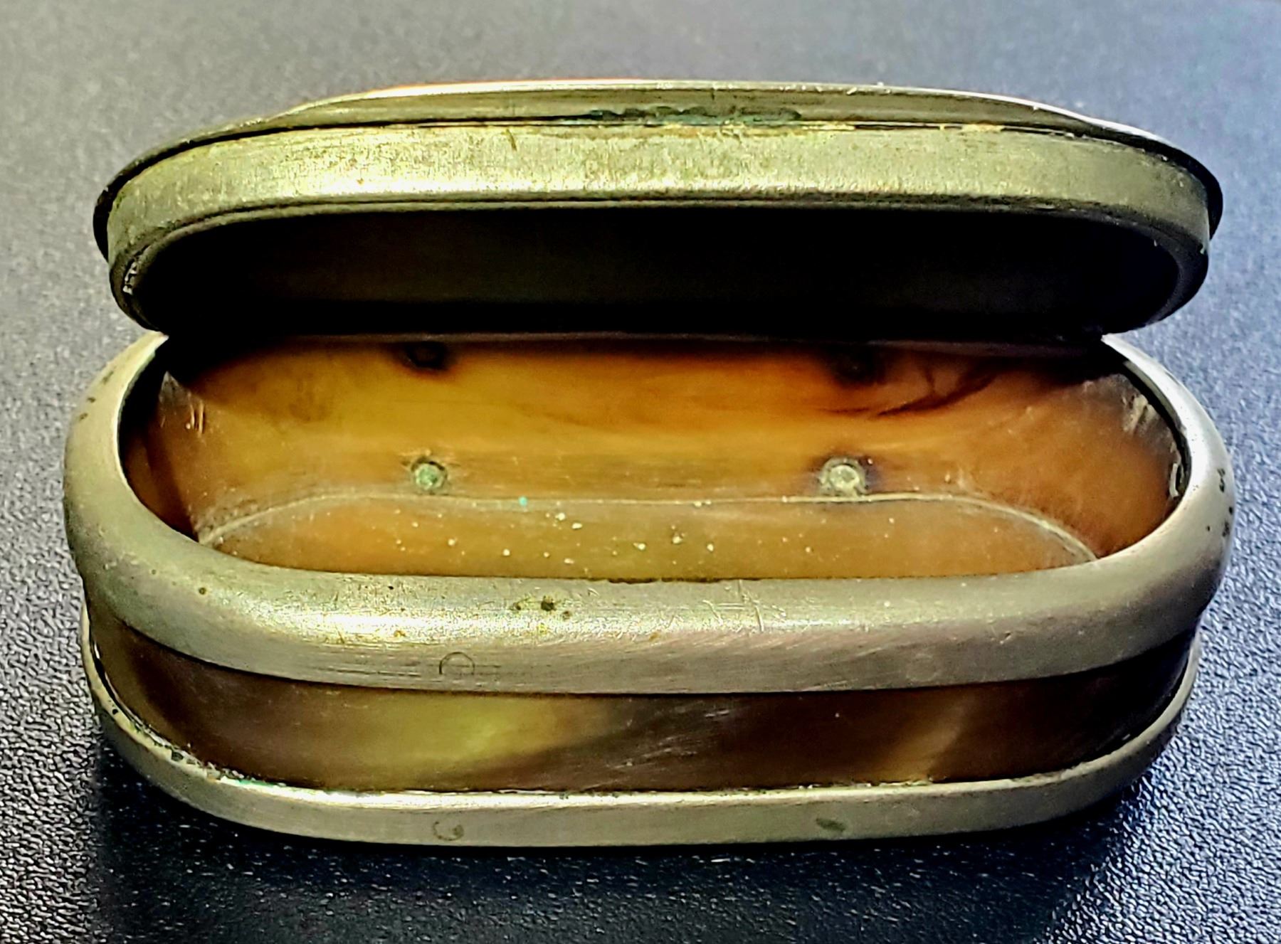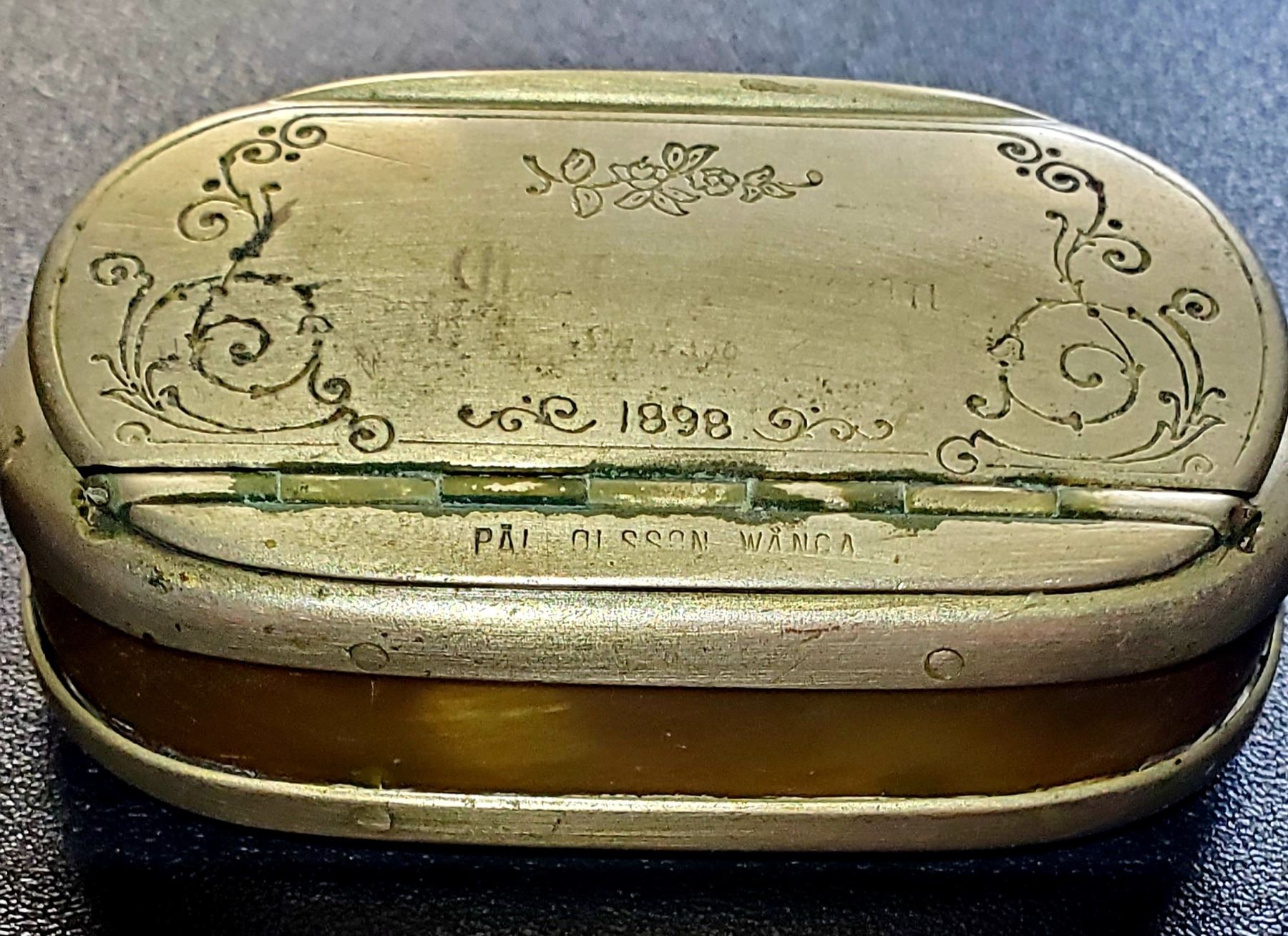1898 Pal Olsson Wanga nickel silver snuff box 1.5 in H x 3 in W x 1.5 in D. In good condition.