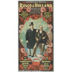 <B>Rusco & Holland (National, 1898)</B></I> Theater Poster (41" X 81"). An unusual poster, promoting the show promoters. While producers lent their name to the events they put on, they rarely issued a poster about themselves. Also unusual is the mention of the word "vaudeville" (a term derived from a tradition of French drinking songs called Vaux de Vivre.) The American format consisted of unrelated songs, dances, acrobatic acts, humorous skits and sketches. Its humble origin was in barrooms, but it came to be the attraction in hundreds of theaters throughout the United States from 1881, when Tony Pastor gave his first big vaudeville show in New York. Rusco and Holland were most famous for their minstrel shows. Very Good/Fine condition on Linen.