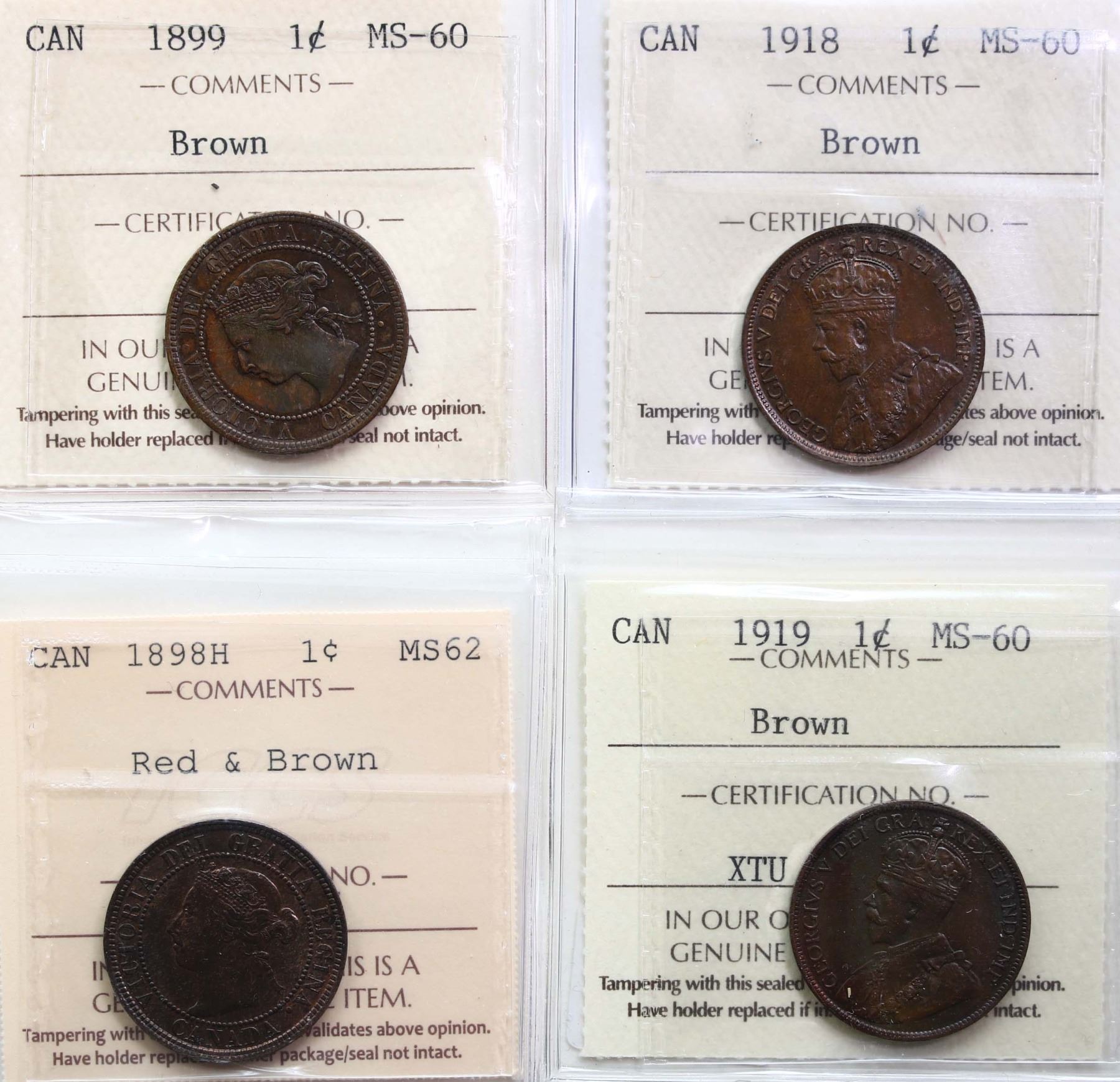 1898H 1¢, 1899, 1918, 1919 All 4 coins ICCS Mint State-60 to Choice Mint State-62.