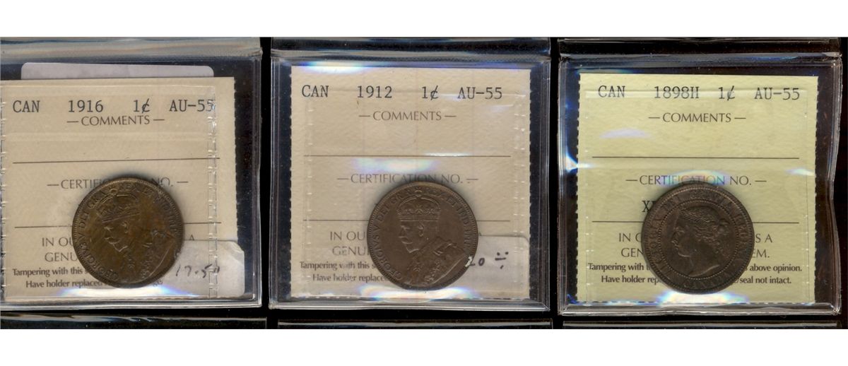 1898H 1¢, 1912 & 1916 ICCS AU55. Lot of 3 coins.