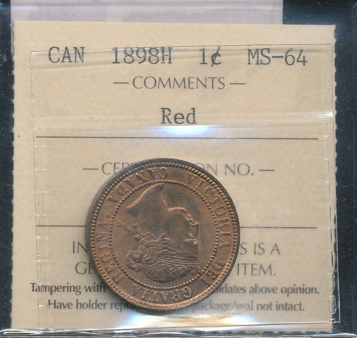 1898H 1¢ ICCS MS64RD. 80% red with lustre and purple tint.