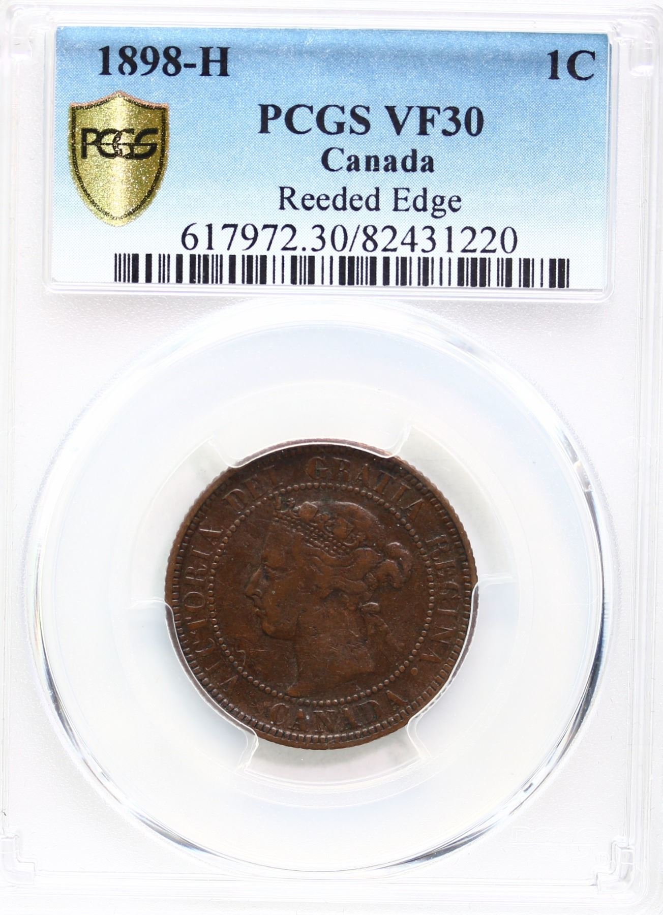 1898H 1¢ "REEDED EDGE" PCGS Choice Very Fine-30. First example graded and first ever example offered by TCNC. By all accounts this example is the only one of its type. A Victorian Copper Penny with Reeded Edge is unheard of. The Unique example details clear and sharply defined reeds, that clearly demonstrate the authenticity of the coin and its variety. Graded by PCGS prior to the Covid years it has remained in private hands until today. Do not miss this opportunity to view and acquire this ultimately Rare example.