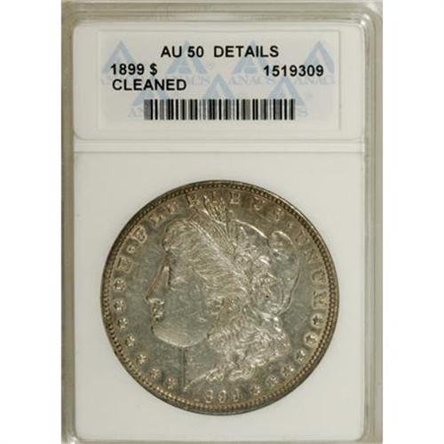<B>1899 $1 --Cleaned--ANACS. AU50 Details.</B></I> NGC Census: (11/5398). PCGS Population (18/7869). Mintage: 330,846. Numismedia Wsl. Price for NGC/PCGS coin in AU50: $183. (#7258)<BR><BR><B>Coin Engraver:</B> George T. Morgan<BR><BR><b>Shipping:</b> Coins & Currency (<a target="_blank" href="http://www.heritageauctions.com/common/shipping.php">view shipping information</a>)