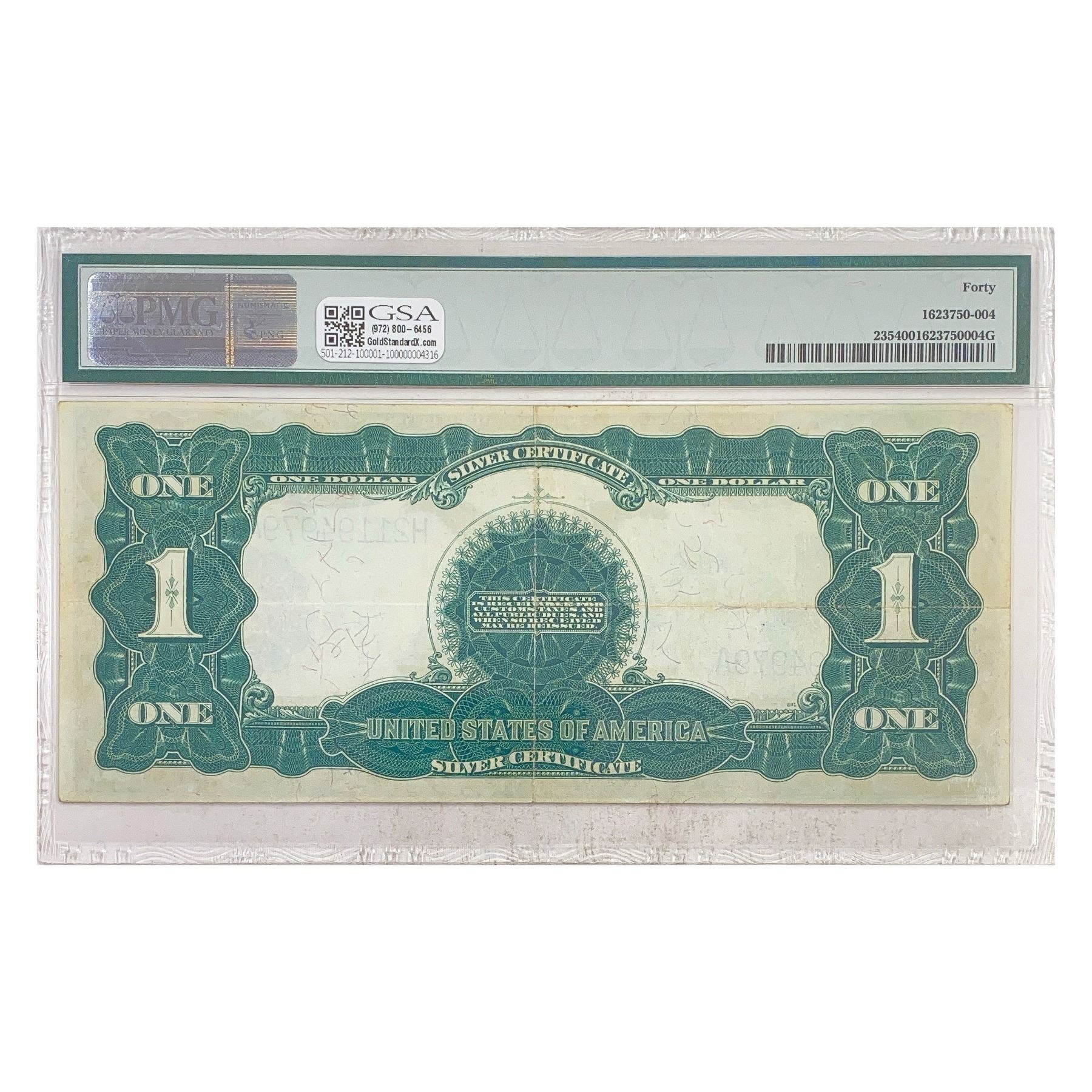 f. Notes sold referencing a third-party grading service are sold “AS IS” without any express or implied warranty, except for guarantee by GSA that they are genuine. Grading, condition or other attributes of any Product may have a material effect on its value and the opinion of others, including third-party grading services such as PCGS Currency and PMG may differ with that of GSA. GSA shall not be bound by any prior or subsequent opinion, determination, or certification by any grading service. Bidders specifically waive any claim to right of return of any Product because of the opinion, determination, or certification, or lack thereof, by any grading service. Certain warranties may be available from the grading services and Bidders are referred to them for further details: Paper Money Guaranty (PMG), PO Box 4711, Sarasota, FL 34230; PCGS Currency, PO Box 10470, Peoria, IL 61612-0470; PCGS Gold Shield, PO Box 9458, Newport Beach, CA 92658. Third-party graded notes are not returnable for any reason whatsoever.