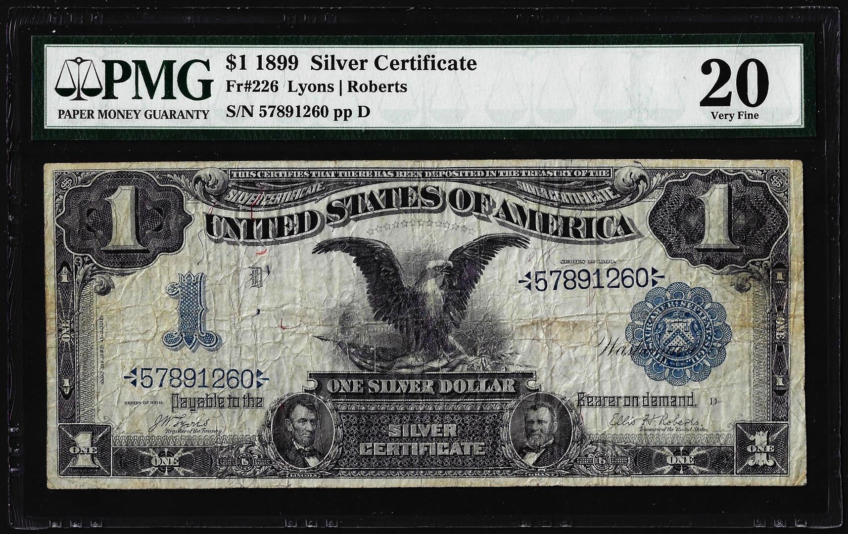 One 1899 $1 Black Eagle Silver Certificate Note Fr.226 PMG Very Fine 20. PMG Certified.