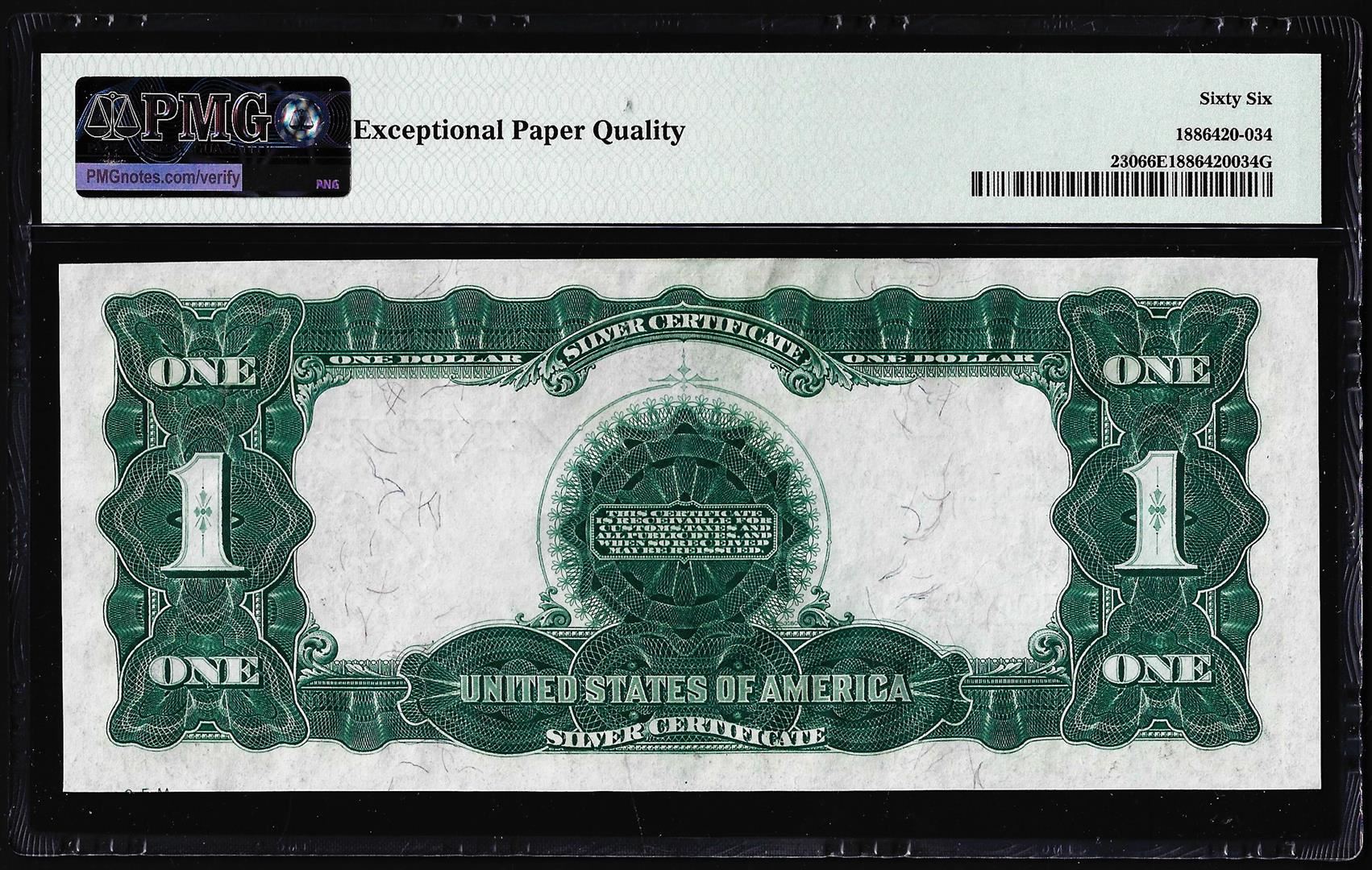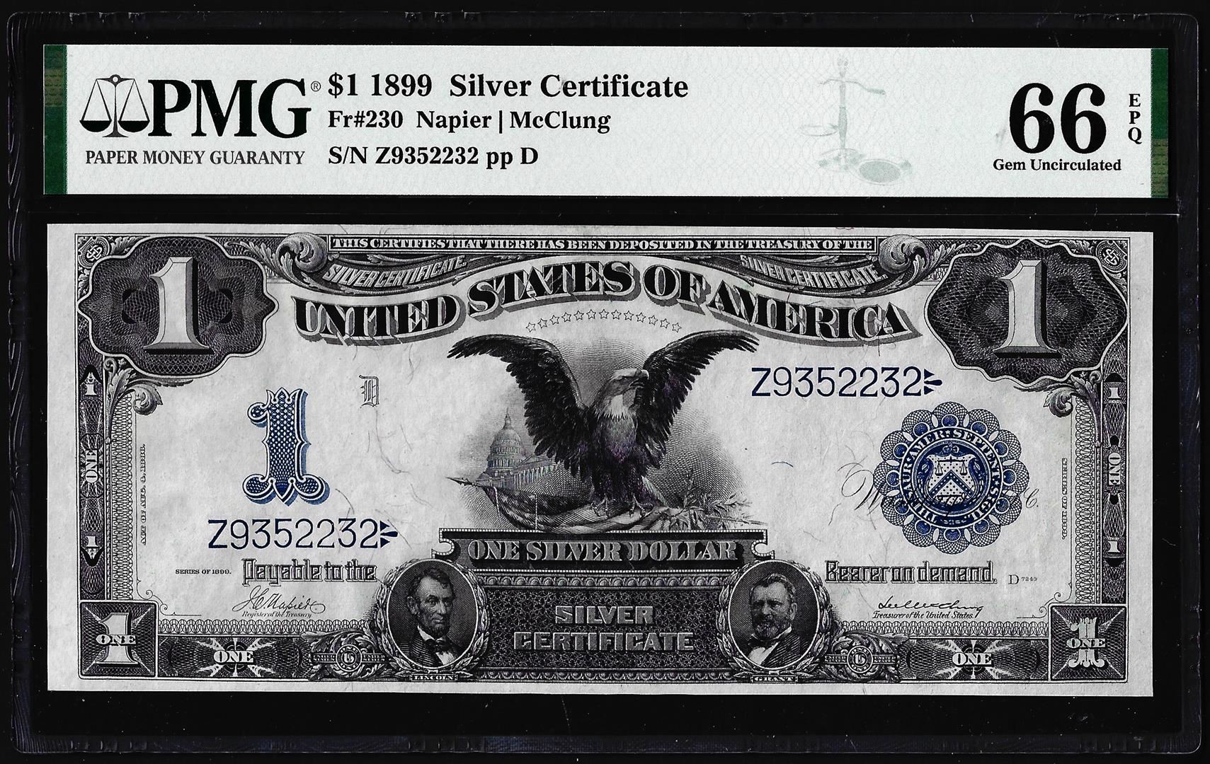 One 1899 $1 Black Eagle Silver Certificate Note Fr.230 PMG Gem Uncirculated 66EPQ. PMG Certified.