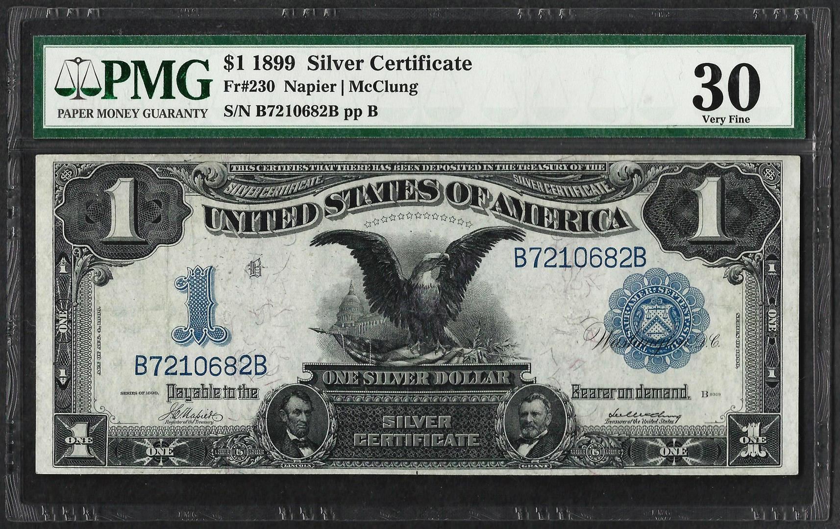 One 1899 $1 Black Eagle Silver Certificate Note Fr.230 PMG Very Fine 30. PMG Certified.