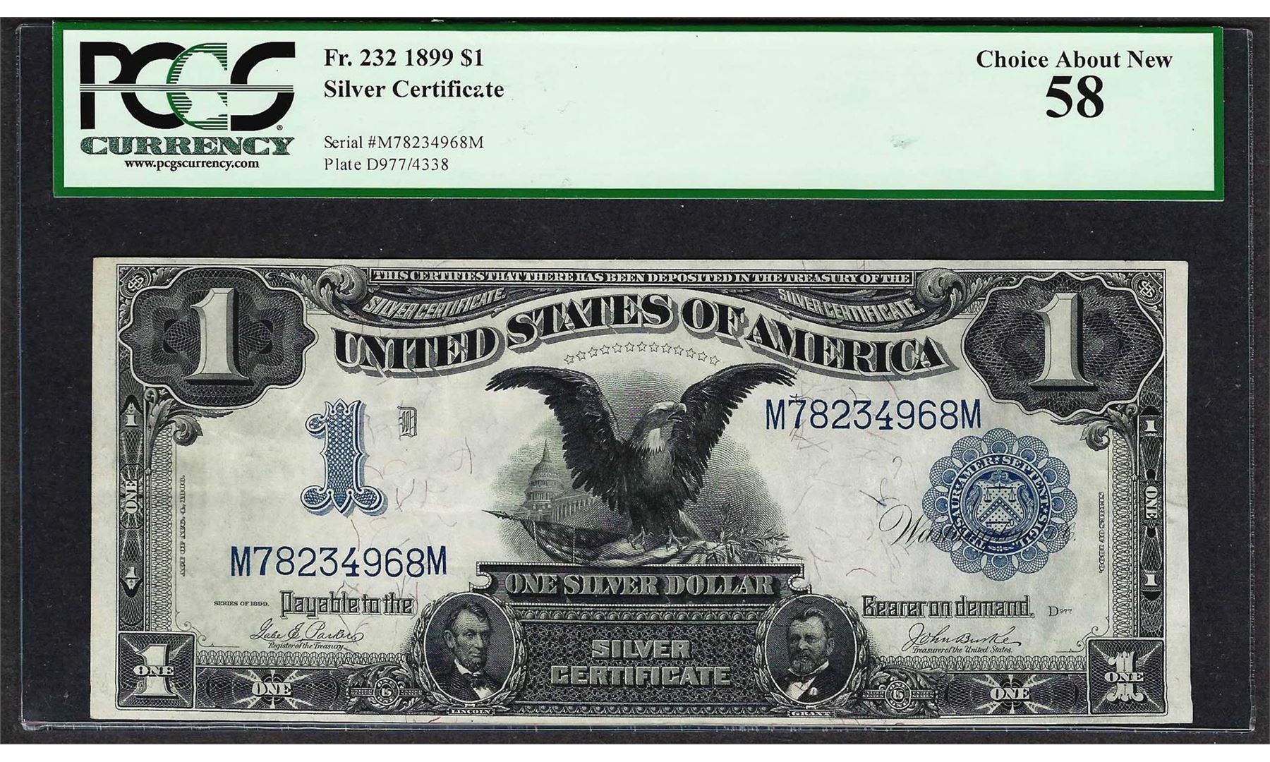 One 1899 $1 Black Eagle Silver Certificate Note Fr.232 PCGS Choice About New 58. PCGS Graded.