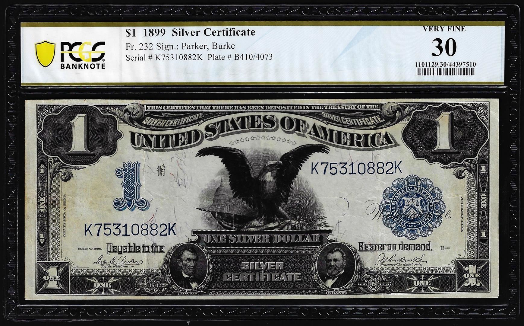 1899 $1 Black Eagle Silver Certificate Note Fr.232 PCGS Very Fine 30