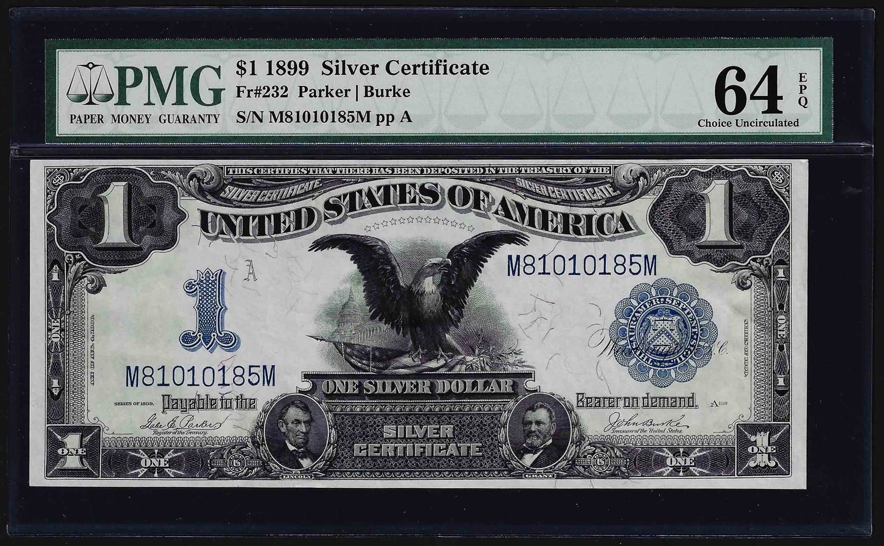 One 1899 $1 Black Eagle Silver Certificate Note Fr.232 PMG Choice Uncirculated 64EPQ. PMG Certified.