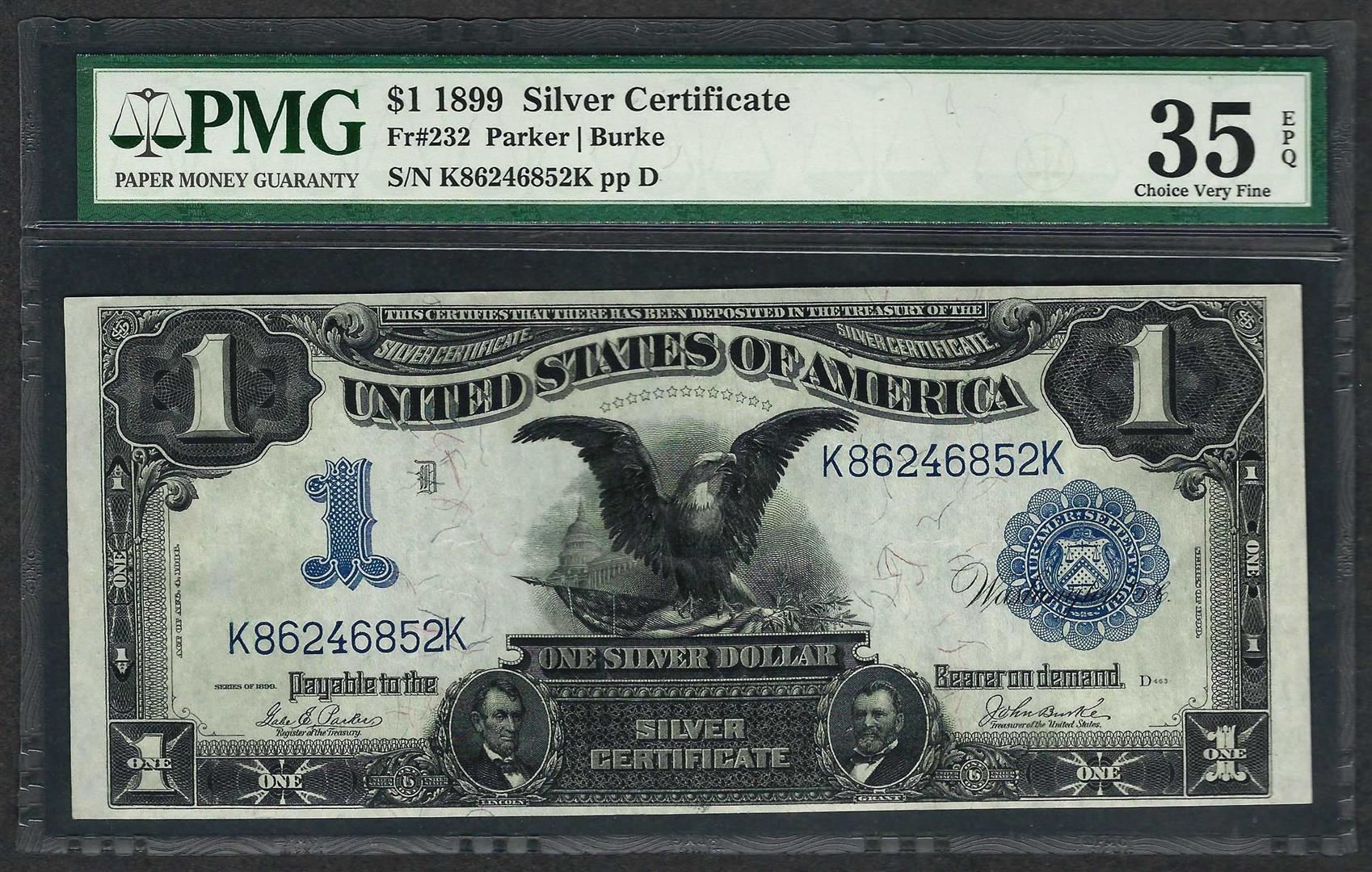 One 1899 $1 Black Eagle Silver Certificate Note Fr.232 PMG Choice Very Fine 35EPQ. PMG Certified.