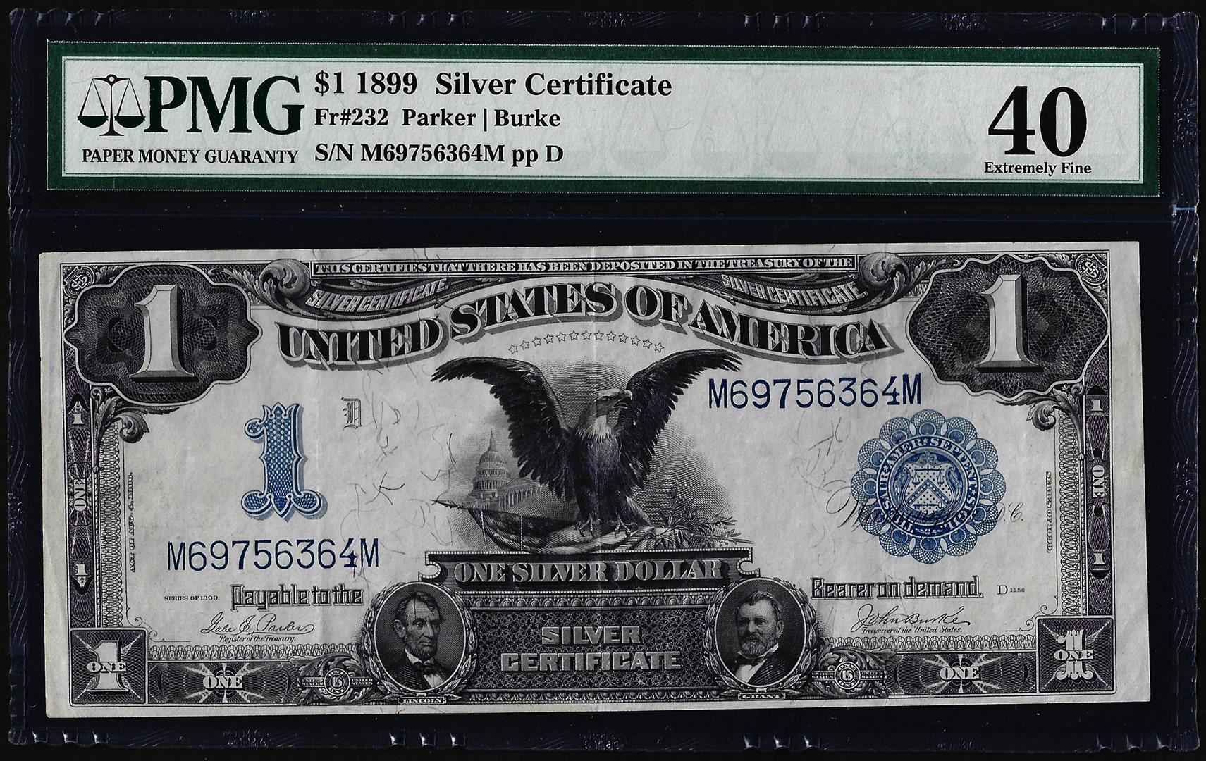One 1899 $1 Black Eagle Silver Certificate Note Fr.232 PMG Extremely Fine 40. PMG Certified.
