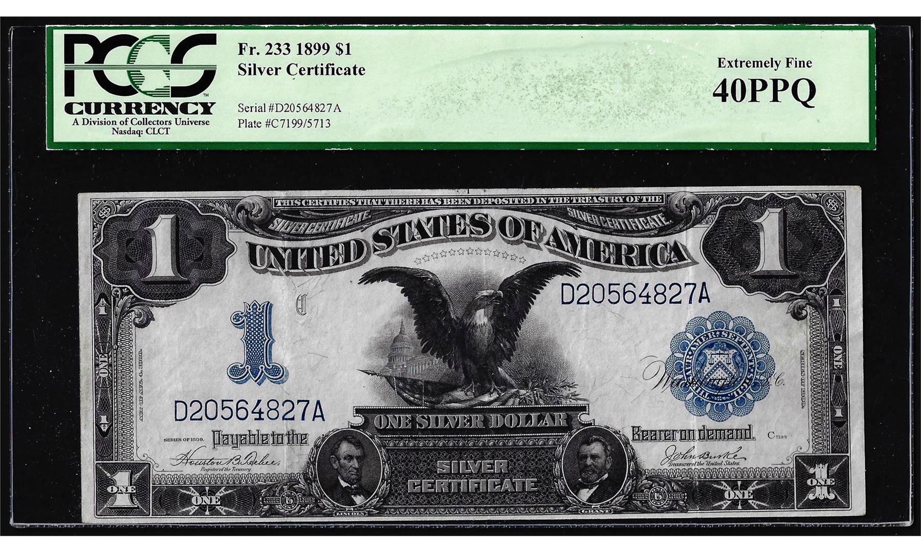 One 1899 $1 Black Eagle Silver Certificate Note Fr.233 PCGS Extremely Fine 40PPQ. PCGS Graded.