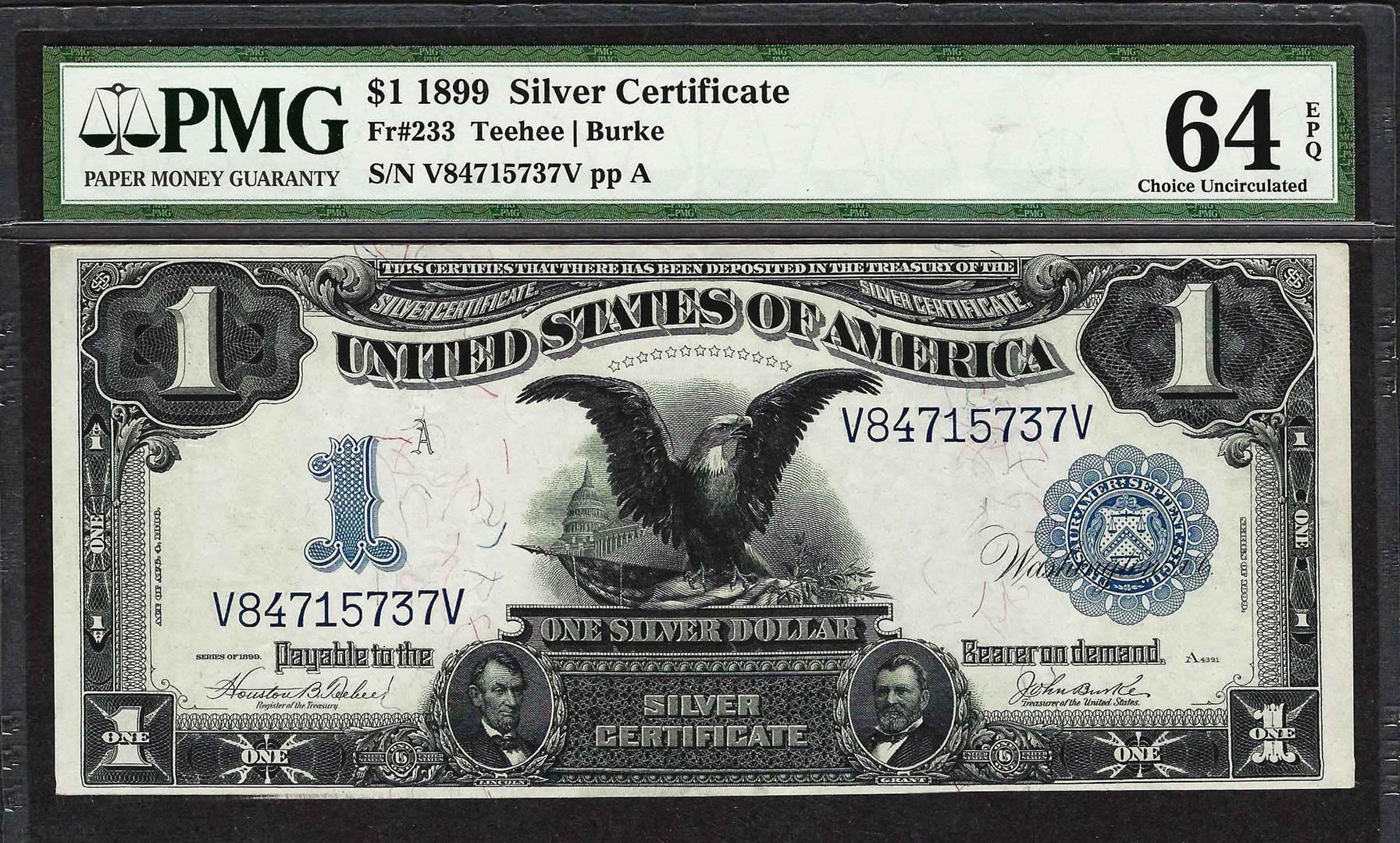 One 1899 $1 Black Eagle Silver Certificate Note Fr.233 PMG Choice Uncirculated 64EPQ. PMG Certified.
