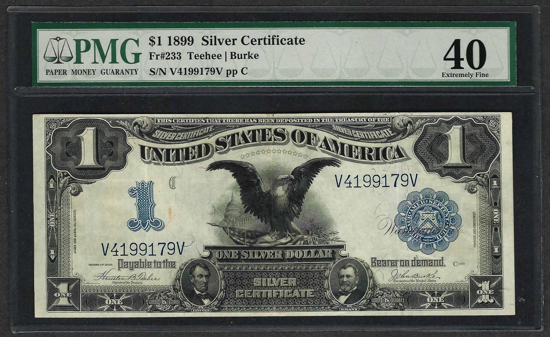 One 1899 $1 Black Eagle Silver Certificate Note Fr.233 PMG Extremely Fine 40. PMG Certified.