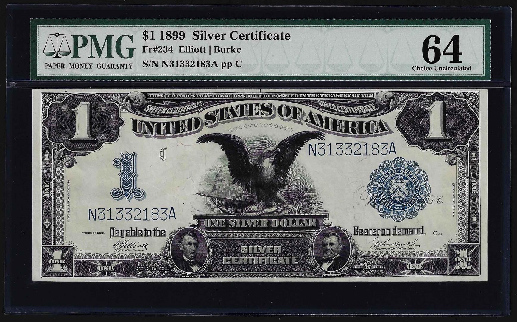 One 1899 $1 Black Eagle Silver Certificate Note Fr.234 PMG Choice Uncirculated 64. PMG Certified.