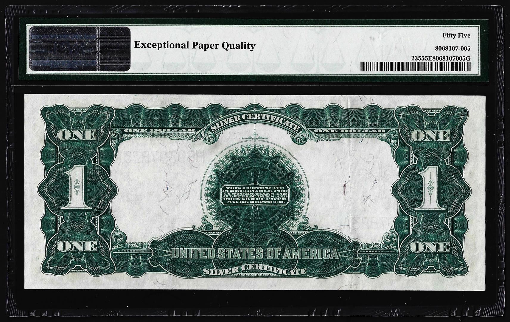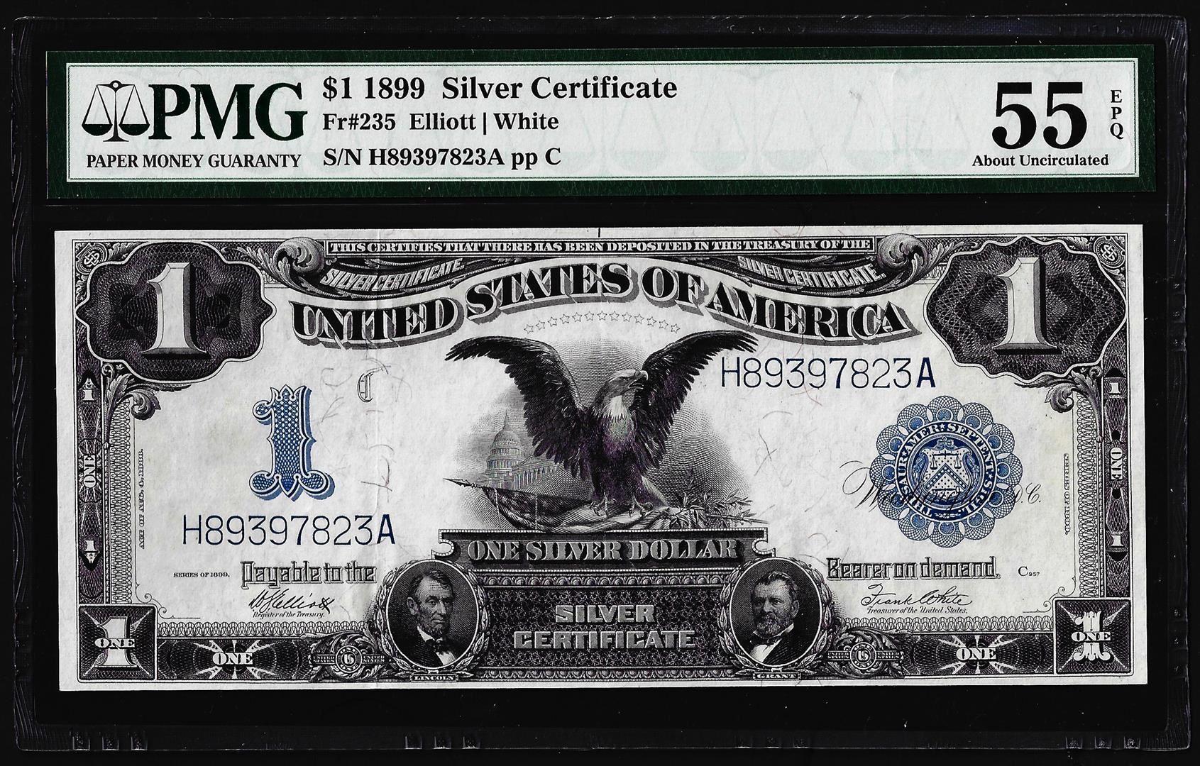 One 1899 $1 Black Eagle Silver Certificate Note Fr.235 PMG About Uncirculated 55EPQ. PMG Certified.