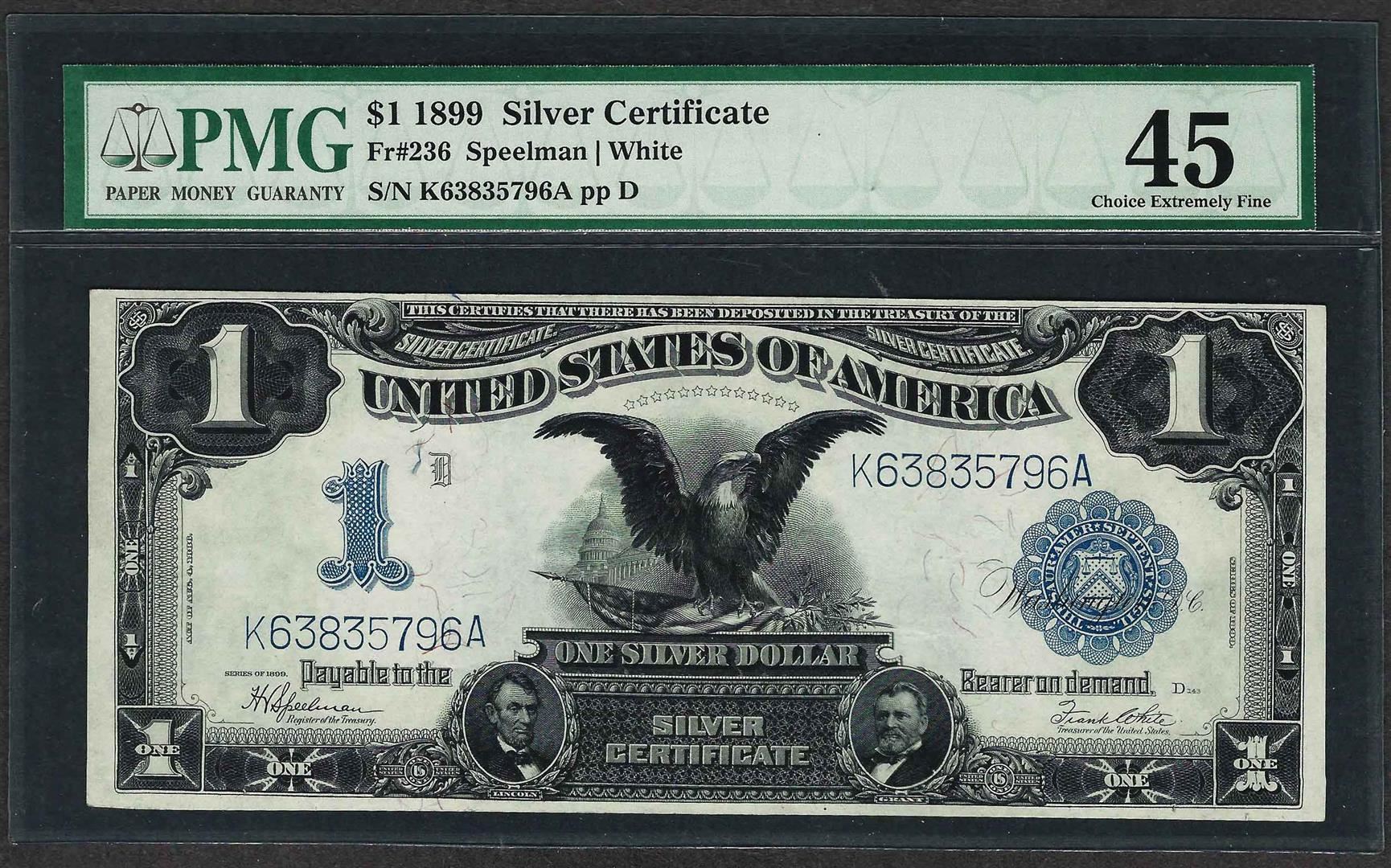 One 1899 $1 Black Eagle Silver Certificate Note Fr.236 PMG Choice Extremely Fine 45. PMG Certified.