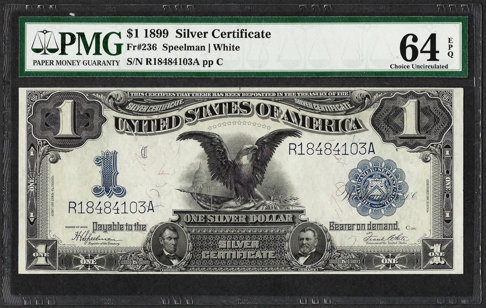 One 1899 $1 Black Eagle Silver Certificate Note Fr.236 PMG Choice Uncirculated 64EPQ. PMG Certified.