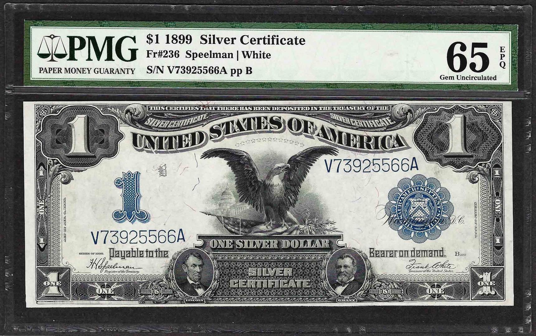 One 1899 $1 Black Eagle Silver Certificate Note Fr.236 PMG Gem Uncirculated 65EPQ. PMG Appraised.