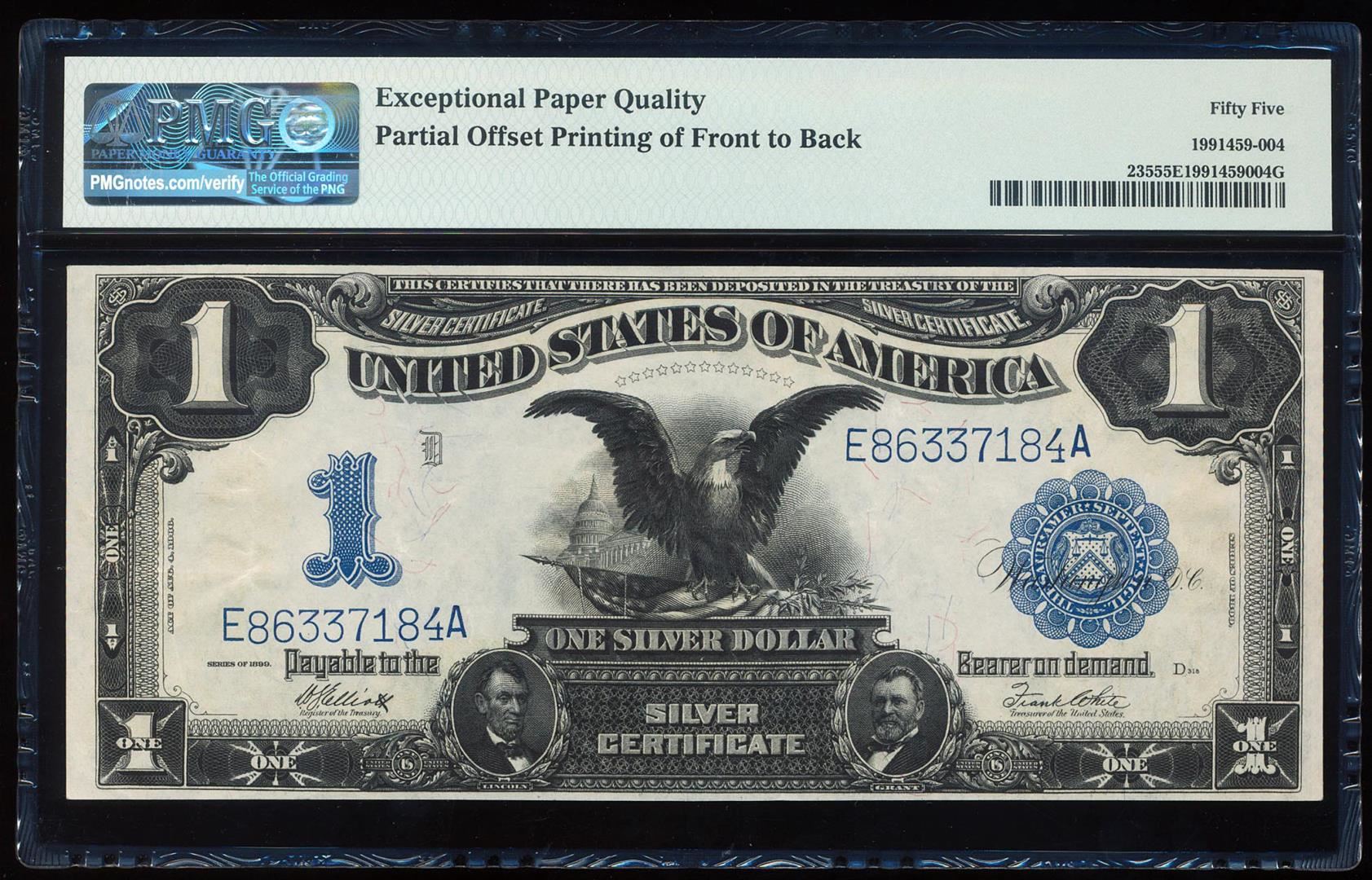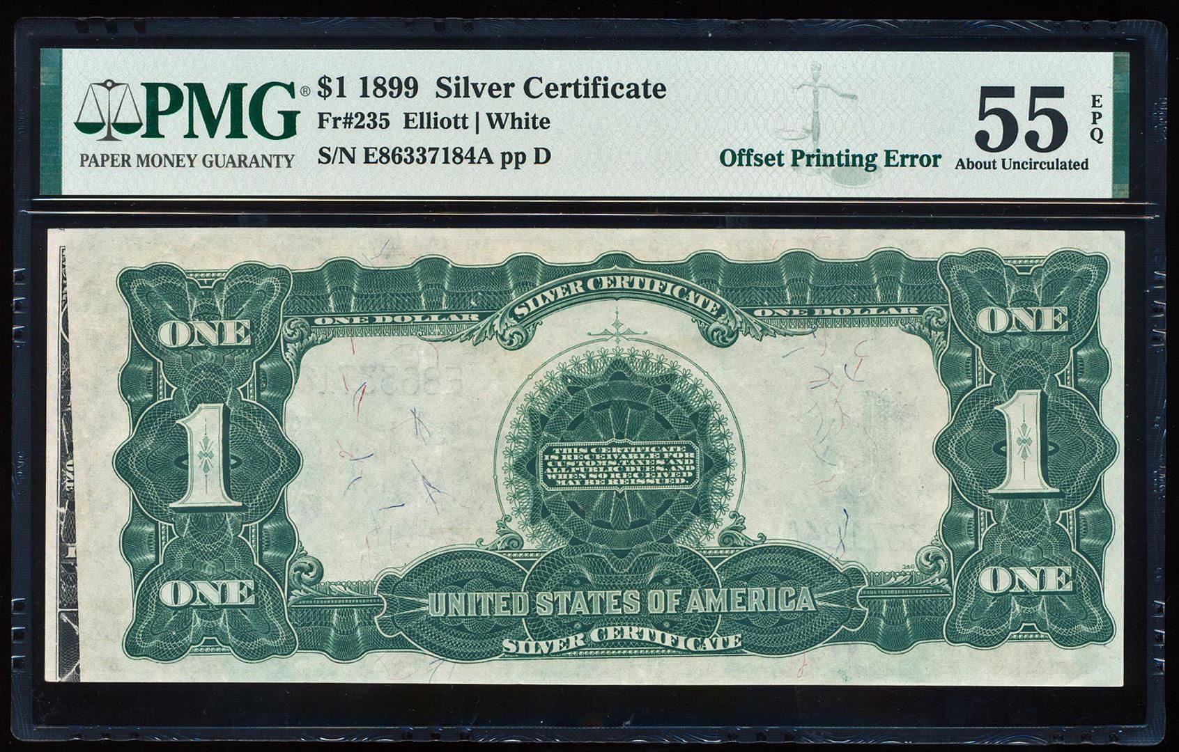 One 1899 $1 Black Eagle Silver Certificate Note Offset Printing ERROR PMG AU55 EPQ. PMG Certified.