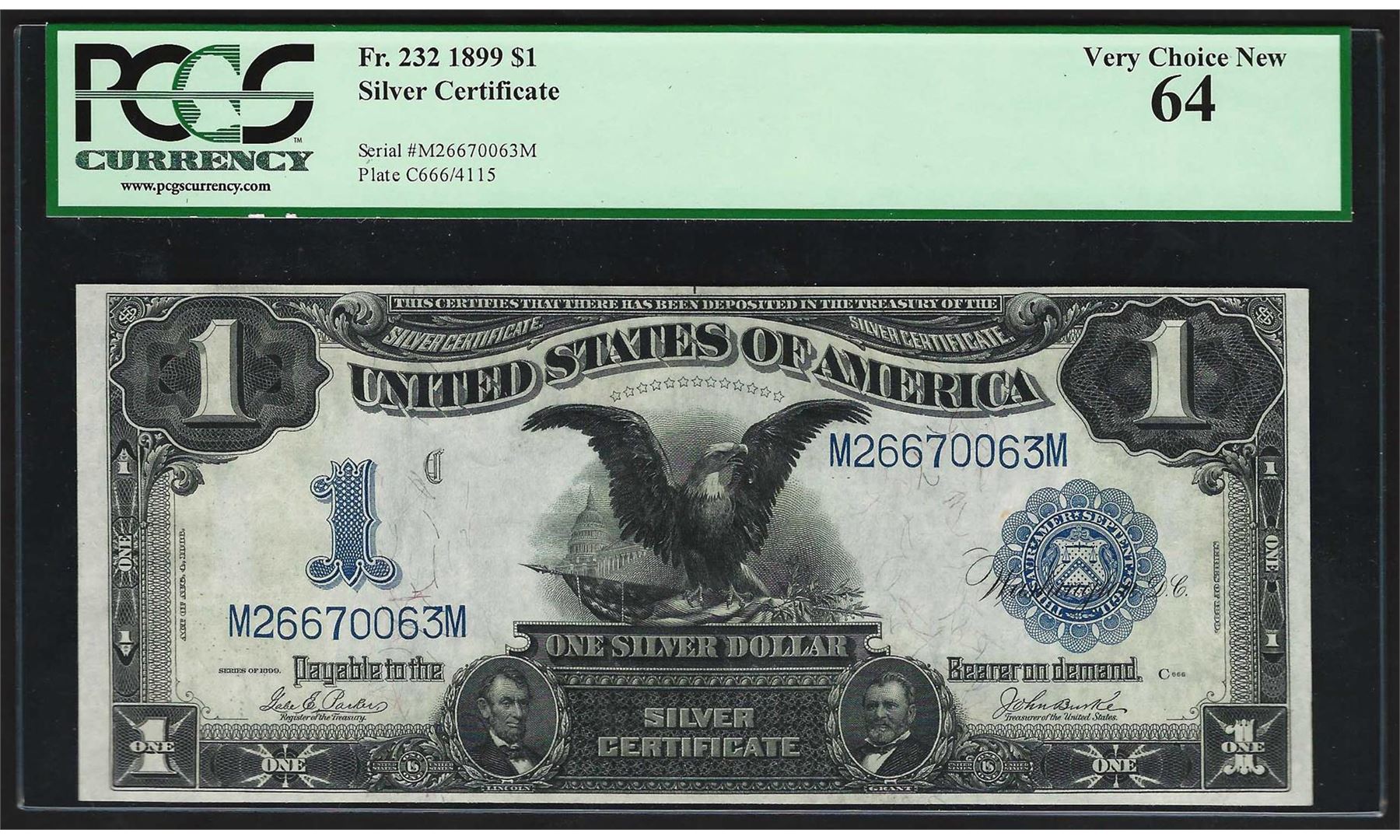 One 1899 $1 Black Eagle Silver Certificate Note PCGS Very Choice New 64. PCGS Graded.