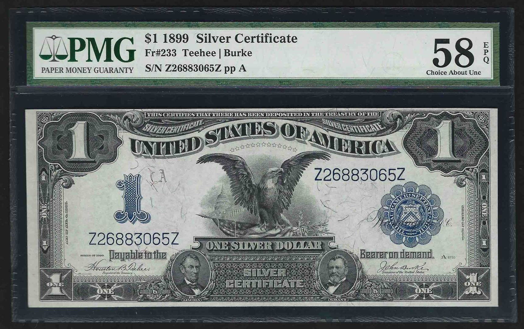One 1899 $1 Black Eagle Silver Certificate Note PMG Choice About Uncirculated 58EPQ. PMG Certified.