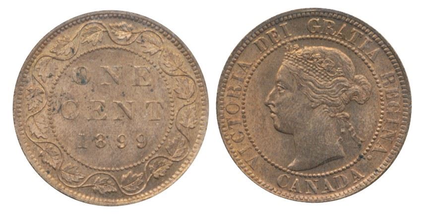 1899 1¢ ICCS MS65RD. Gem lustre 90% red issue.