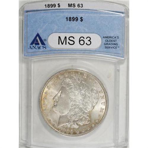 <B>1899 $1 MS63 ANACS.</B></I> NGC Census: (1698/2811). PCGS Population (2781/3987). Mintage: 330,846. Numismedia Wsl. Price for NGC/PCGS coin in MS63: $300. (#7258)<BR><BR><B>Coin Engraver:</B> George T. Morgan<BR><BR><b>Shipping:</b> Coins & Currency (<a target="_blank" href="http://www.heritageauctions.com/common/shipping.php">view shipping information</a>)