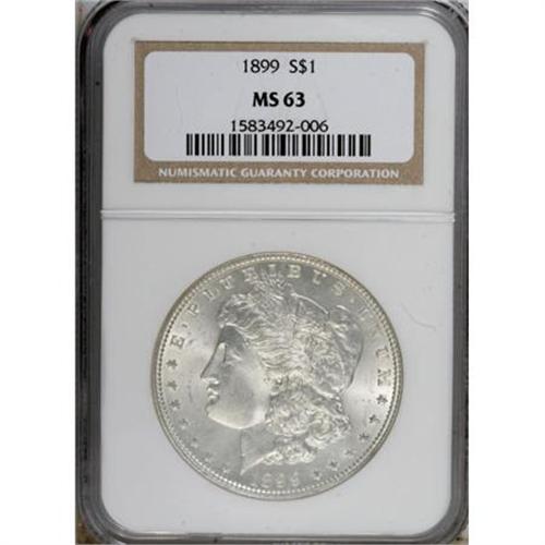 <B>1899 $1 MS63 NGC.</B></I> NGC Census: (1681/2796). PCGS Population (2701/3919). Mintage: 330,846. Numismedia Wsl. Price for NGC/PCGS coin in MS63: $300. (#7258)<BR><BR><B>Coin Engraver:</B> George T. Morgan<BR><BR><b>Shipping:</b> Coins & Currency (<a target="_blank" href="http://www.heritageauctions.com/common/shipping.php">view shipping information</a>)