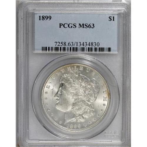 <B>1899 $1 MS63 PCGS.</B></I> PCGS Population (2781/3987). NGC Census: (1698/2811). Mintage: 330,846. Numismedia Wsl. Price for NGC/PCGS coin in MS63: $300. (#7258)<BR><BR><B>Coin Engraver:</B> George T. Morgan<BR><BR><b>Shipping:</b> Coins & Currency (<a target="_blank" href="http://www.heritageauctions.com/common/shipping.php">view shipping information</a>)