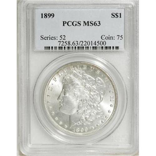 <B>1899 $1 MS63 PCGS.</B></I> . PCGS Population (2822/4064). NGC Census: (1759/2879). Mintage: 330,846. Numismedia Wsl. Price for NGC/PCGS coin in MS63: $300. (#7258)<BR><BR><B>Coin Engraver:</B> George T. Morgan<BR><BR><b>Shipping:</b> Coins & Currency (<a target="_blank" href="http://www.heritageauctions.com/common/shipping.php">view shipping information</a>)