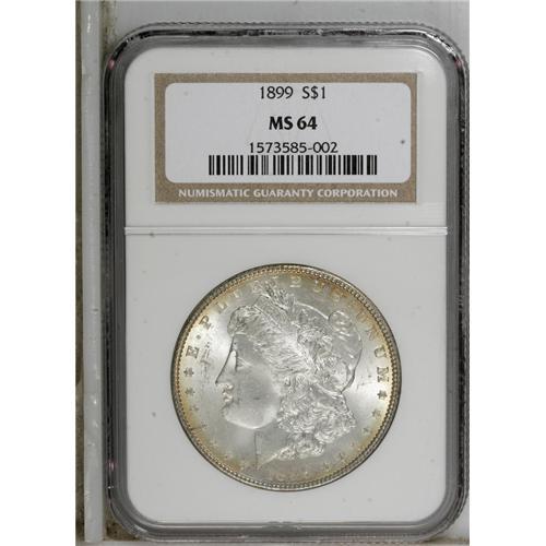 <B>1899 $1 MS64 NGC.</B></I> NGC Census: (2189/561). PCGS Population (2842/1009). Mintage: 330,846. Numismedia Wsl. Price for NGC/PCGS coin in MS64: $400. (#7258)<BR><BR><b>Shipping:</b> Coins & Currency (<a target="_blank" href="http://www.heritageauctions.com/common/shipping.php">view shipping information</a>)