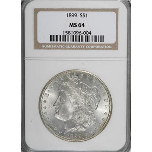 <B>1899 $1 MS64 NGC.</B></I> NGC Census: (2236/575). PCGS Population (2933/1054). Mintage: 330,846. Numismedia Wsl. Price for NGC/PCGS coin in MS64: $400. (#7258)<BR><BR><B>Coin Engraver:</B> George T. Morgan<BR><BR><b>Shipping:</b> Coins & Currency (<a target="_blank" href="http://www.heritageauctions.com/common/shipping.php">view shipping information</a>)