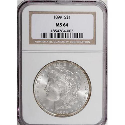 <B>1899 $1 MS64 NGC.</B></I> NGC Census: (2217/571). PCGS Population (2876/1027). Mintage: 330,846. Numismedia Wsl. Price for NGC/PCGS coin in MS64: $392. (#7258)<BR><BR><B>Coin Engraver:</B> George T. Morgan<BR><BR><b>Shipping:</b> Coins & Currency (<a target="_blank" href="http://www.heritageauctions.com/common/shipping.php">view shipping information</a>)