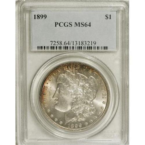<B>1899 $1 MS64 PCGS.</B></I> PCGS Population (2842/1007). NGC Census: (2204/568). Mintage: 330,846. Numismedia Wsl. Price for NGC/PCGS coin in MS64: $392. (#7258)<BR><BR><b>Shipping:</b> Coins & Currency (<a target="_blank" href="http://www.heritageauctions.com/common/shipping.php">view shipping information</a>)