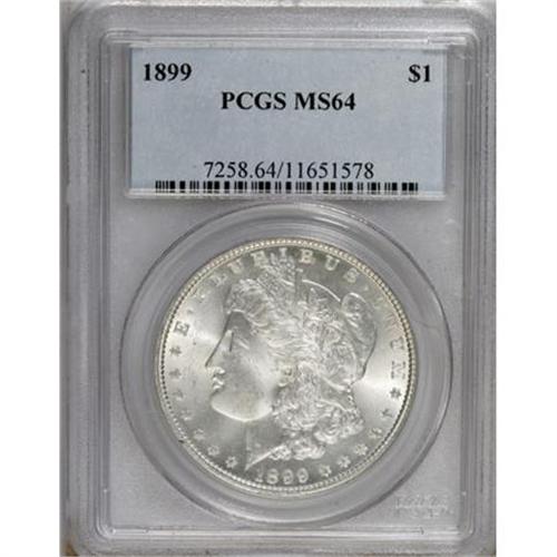 <B>1899 $1 MS64 PCGS.</B></I> PCGS Population (2890/1039). NGC Census: (2236/575). Mintage: 330,846. Numismedia Wsl. Price for NGC/PCGS coin in MS64: $400. (#7258)<BR><BR><B>Coin Engraver:</B> George T. Morgan<BR><BR><b>Shipping:</b> Coins & Currency (<a target="_blank" href="http://www.heritageauctions.com/common/shipping.php">view shipping information</a>)