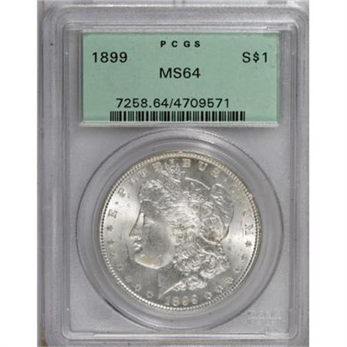 <B>1899 $1 MS64 PCGS.</B></I> PCGS Population (2944/1059). NGC Census: (2236/575). Mintage: 330,846. Numismedia Wsl. Price for NGC/PCGS coin in MS64: $400. (#7258)<BR><BR><B>Coin Engraver:</B> George T. Morgan<BR><BR><b>Shipping:</b> Coins & Currency (<a target="_blank" href="http://www.heritageauctions.com/common/shipping.php">view shipping information</a>)