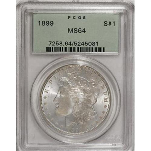 <B>1899 $1 MS64 PCGS.</B></I> . PCGS Population (2979/1085). NGC Census: (2297/588). Mintage: 330,846. Numismedia Wsl. Price for NGC/PCGS coin in MS64: $385. (#7258)<BR><BR><B>Coin Engraver:</B> George T. Morgan<BR><BR><b>Shipping:</b> Coins & Currency (<a target="_blank" href="http://www.heritageauctions.com/common/shipping.php">view shipping information</a>)