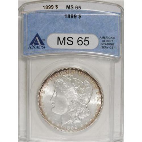 <B>1899 $1 MS65 ANACS.</B></I> Crisply struck with strong luster. The centers are essentially untoned, though whispers of violet and orange are evident at the margins. A few faint flaws are consistent with the grade assigned.<BR><BR><B>Coin Engraver:</B> George T. Morgan<BR><BR><b>Shipping:</b> Coins & Currency (<a target="_blank" href="http://www.heritageauctions.com/common/shipping.php">view shipping information</a>)