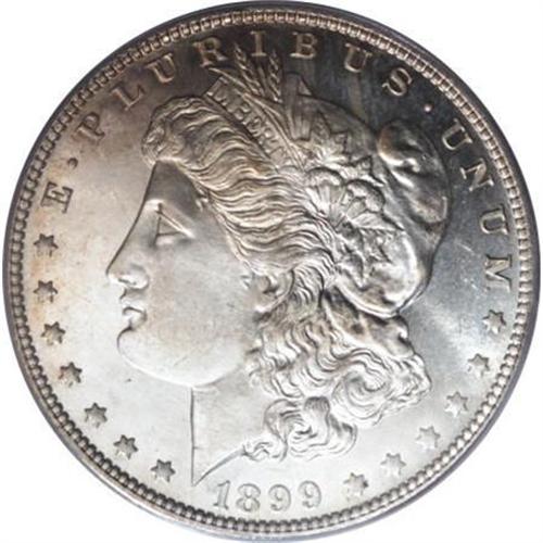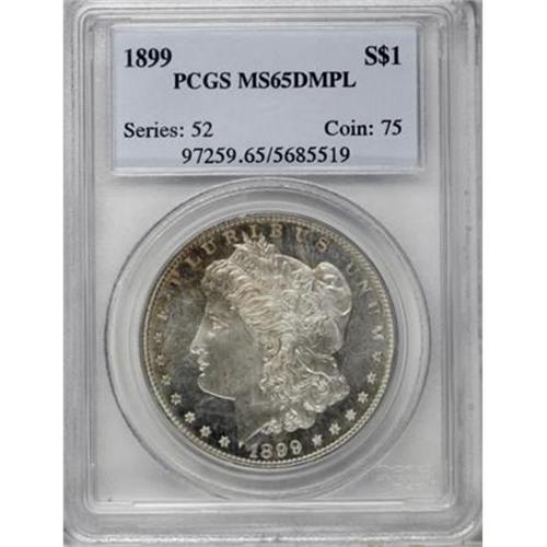 <B>1899 $1 MS65 Deep Mirror Prooflike PCGS.</B></I> The 1899 dollar is a semi-scarce date with a low mintage (330,000 business strikes). This deeply mirrored Gem exhibits strong motif definition, including sharpness in the hair at Liberty's ear and on the eagle's breast feathers. Essentially untoned surfaces reveal just a few minor obverse handling marks. Population: 48 in 65 Deep Mirror Prooflike, 16 finer (11/07).<BR><BR><b>Shipping:</b> Coins & Currency (<a target="_blank" href="http://www.heritageauctions.com/common/shipping.php">view shipping information</a>)