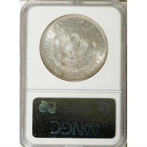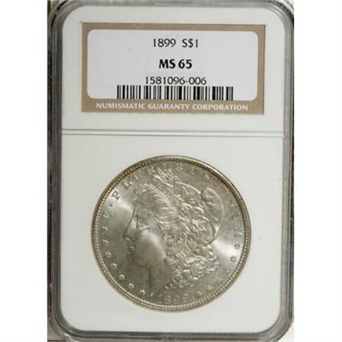 <B>1899 $1 MS65 NGC.</B></I> A large number of high grade 1899 dollars have been consigned to this auction, which present the collector with a rare opportunity to make his or her selection for a high grade set of Morgans. This piece shows light gray-golden toning over each side with the usual strong underlying mint luster. Fully struck.<BR><BR><B>Coin Engraver:</B> George T. Morgan<BR><BR><b>Shipping:</b> Coins & Currency (<a target="_blank" href="http://www.heritageauctions.com/common/shipping.php">view shipping information</a>)