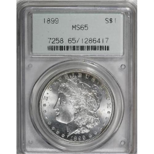 <B>1899 $1 MS65 PCGS.</B></I> Hints of caramel-gold enrich the borders of this razor-sharp and lightly abraded low mintage Gem. The reverse is nearly immaculate. Housed in an early generation holder.<BR><BR><B>Coin Engraver:</B> George T. Morgan<BR><BR><b>Shipping:</b> Coins & Currency (<a target="_blank" href="http://www.heritageauctions.com/common/shipping.php">view shipping information</a>)